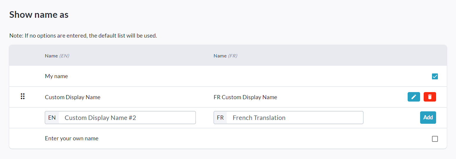 From this page, you can enter your own custom display name options for donors to select from.