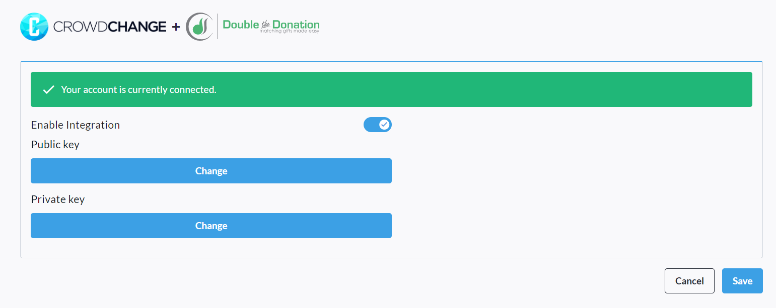 Please Note: This integration is NOT available by default and must first be enabled on your site by your CrowdChange Partner Success Representative. You will also be required to set up a Double the Donation account in order can use this integration. Please reach out to your Partner Success Representative today to be connected.