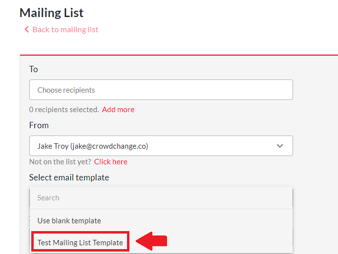 After creating a Mailing List template at the Admin level, it will be available whenever a fundraiser owner goes to Manage Fundraiser → Mailing List and creates an email campaign.