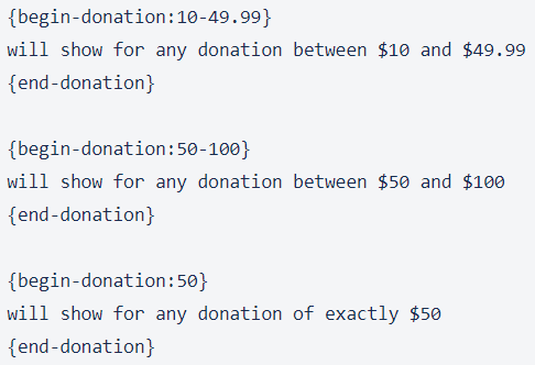 If you would like to send specific text, or a bigger ‘Thank You’ depending on the amount that was donated, you can do so using the example syntax shown below: