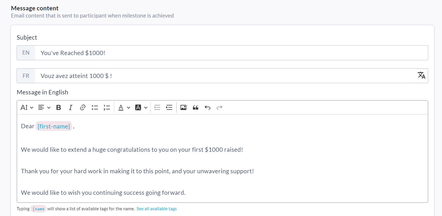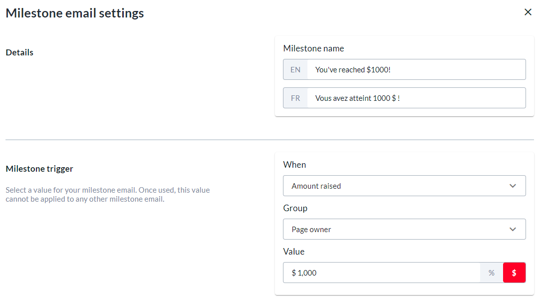 See the example milestone below which will be sent to page owners when they reach $1000 raised.