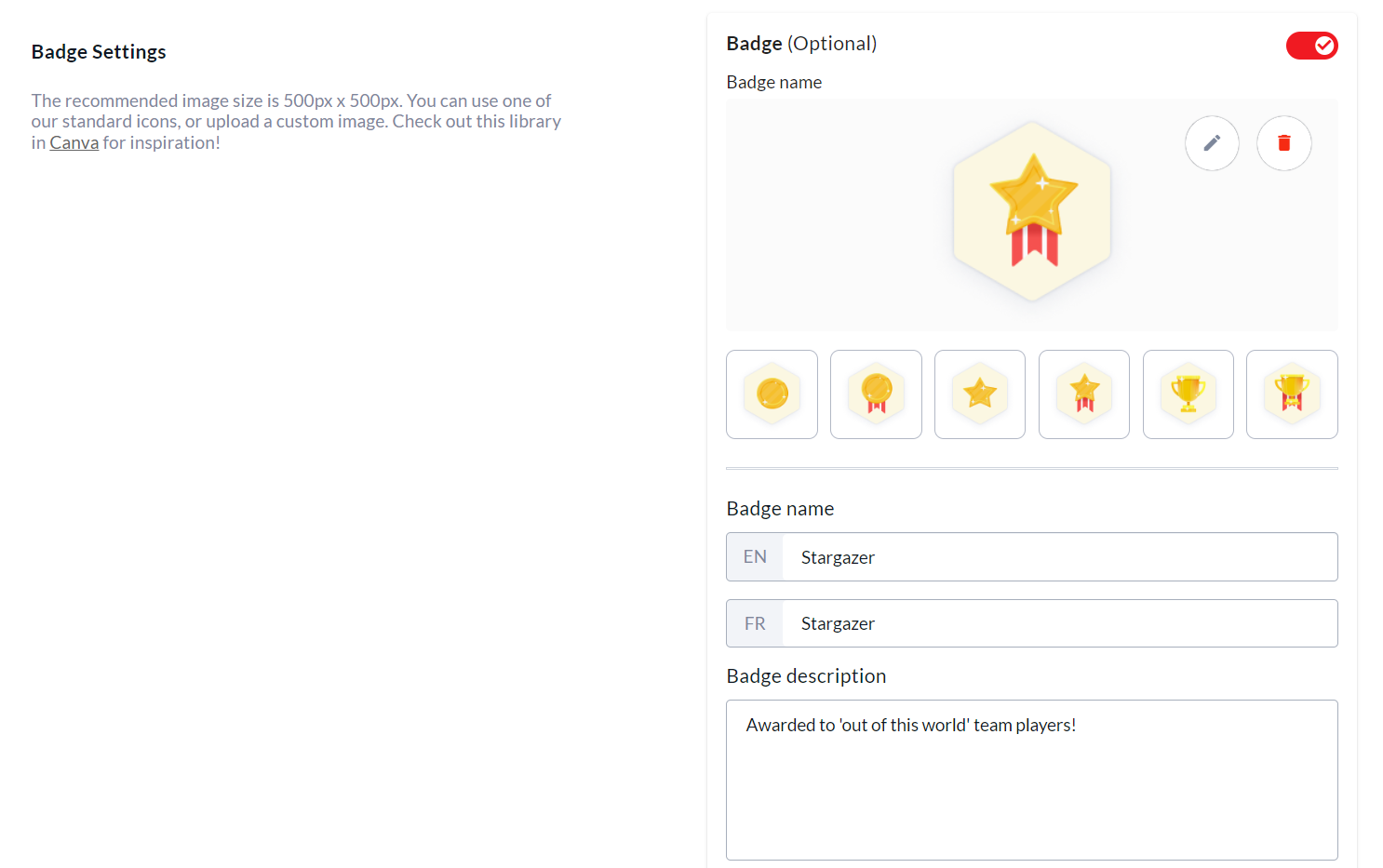 You will also have the option of adding a Badge to the milestone email. See example screenshot below. This is an awesome way to reward fundraisers for their hard work and support of your cause! You can select from our pre-built badges, or upload your own custom badge image using the pencil icon.