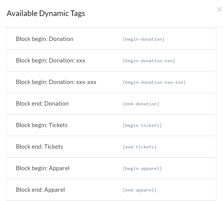 If ‘Donor Receipt’ email template includes {begin-tickets}Your tickets are attached to this email{end-tickets} in the content, this text will only be included in the email if the donor purchases at least one ticket.