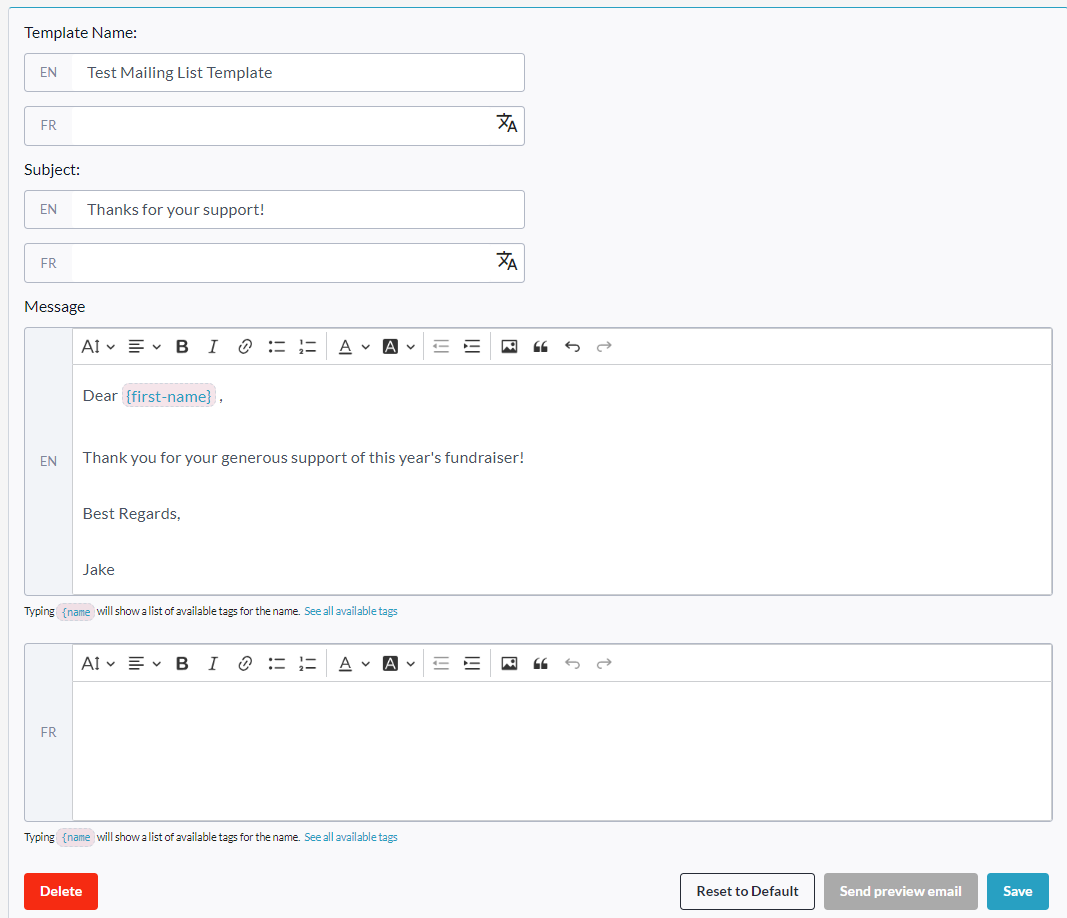 Automated (preset) email templates - These include donor receipts, and certain automated actions like "Fundraiser reached the goal".