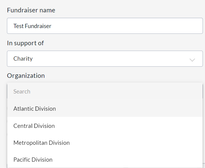 With this feature enabled, when creating a fundraiser, a user will be prompted to select their organization. Using the Admin menu, site-wide administrators are able to set a default Organization if there is a specific one that is used more than the others.