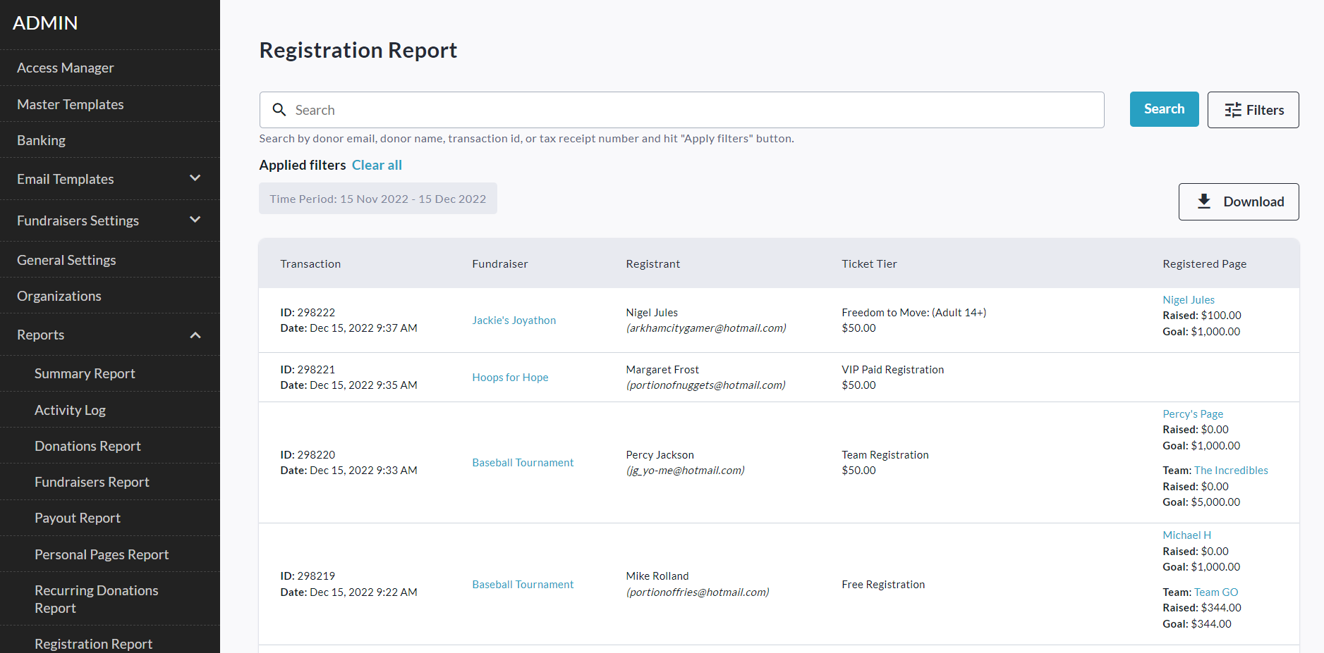 You also have the ability to search for specific registrations (by email, name, or transaction ID), and filter the report for a specific time period, fundraiser, subsite and/or organization.