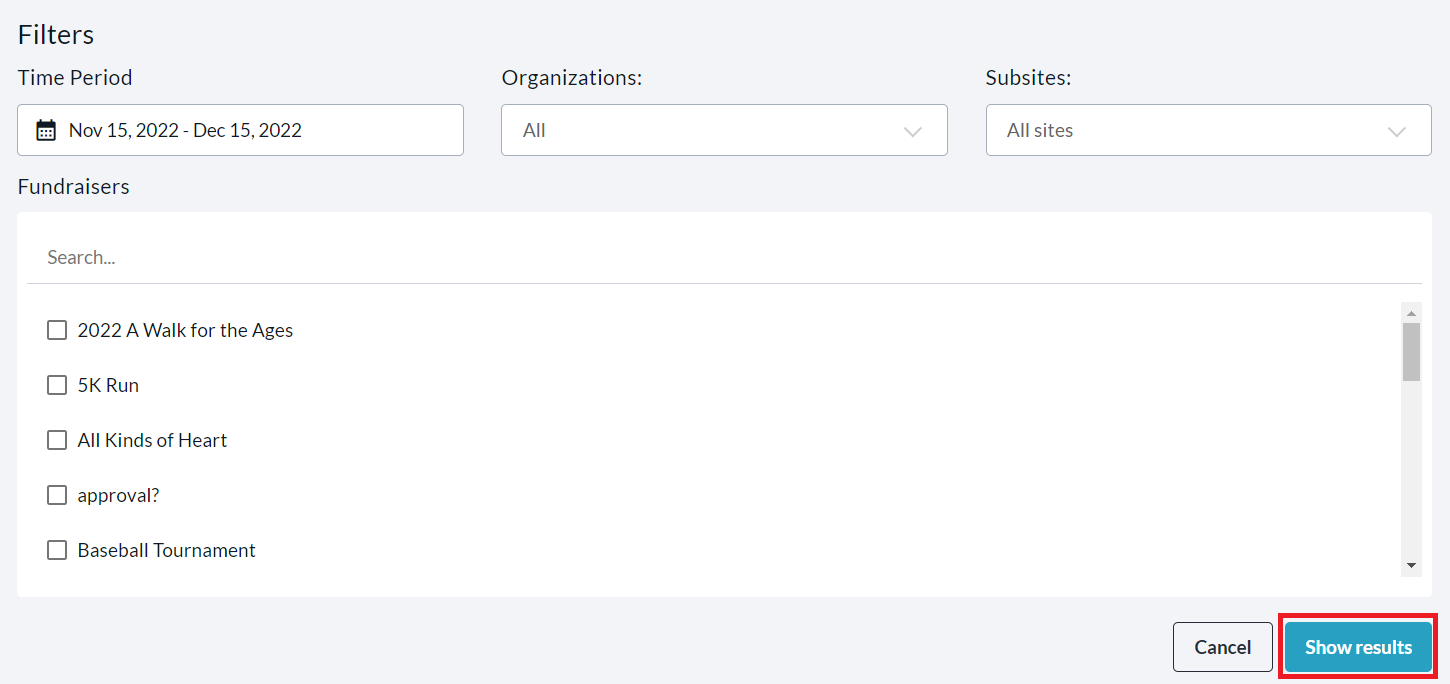 To find a specific registration, you can use the search bar to search by email, name, or transaction ID. Click Filters in the top right corner to filter for a specific Time Period, Organization, Subsite, or Fundraiser. Be sure to click Show results to apply these filters.