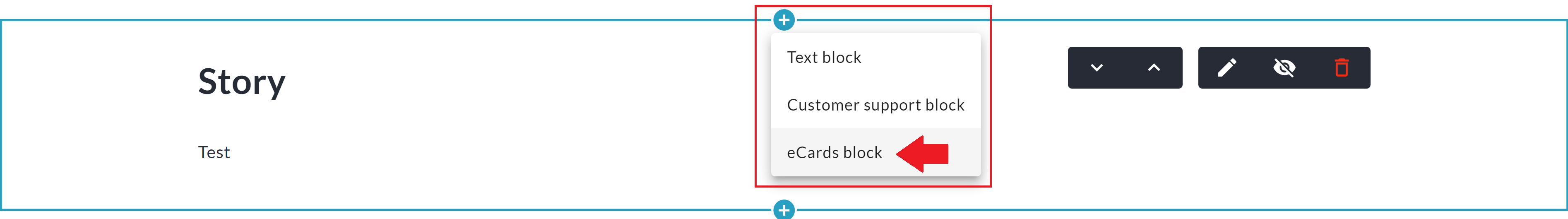 Scroll down, hover over an existing block, and click the '+' icon and select eCards block.