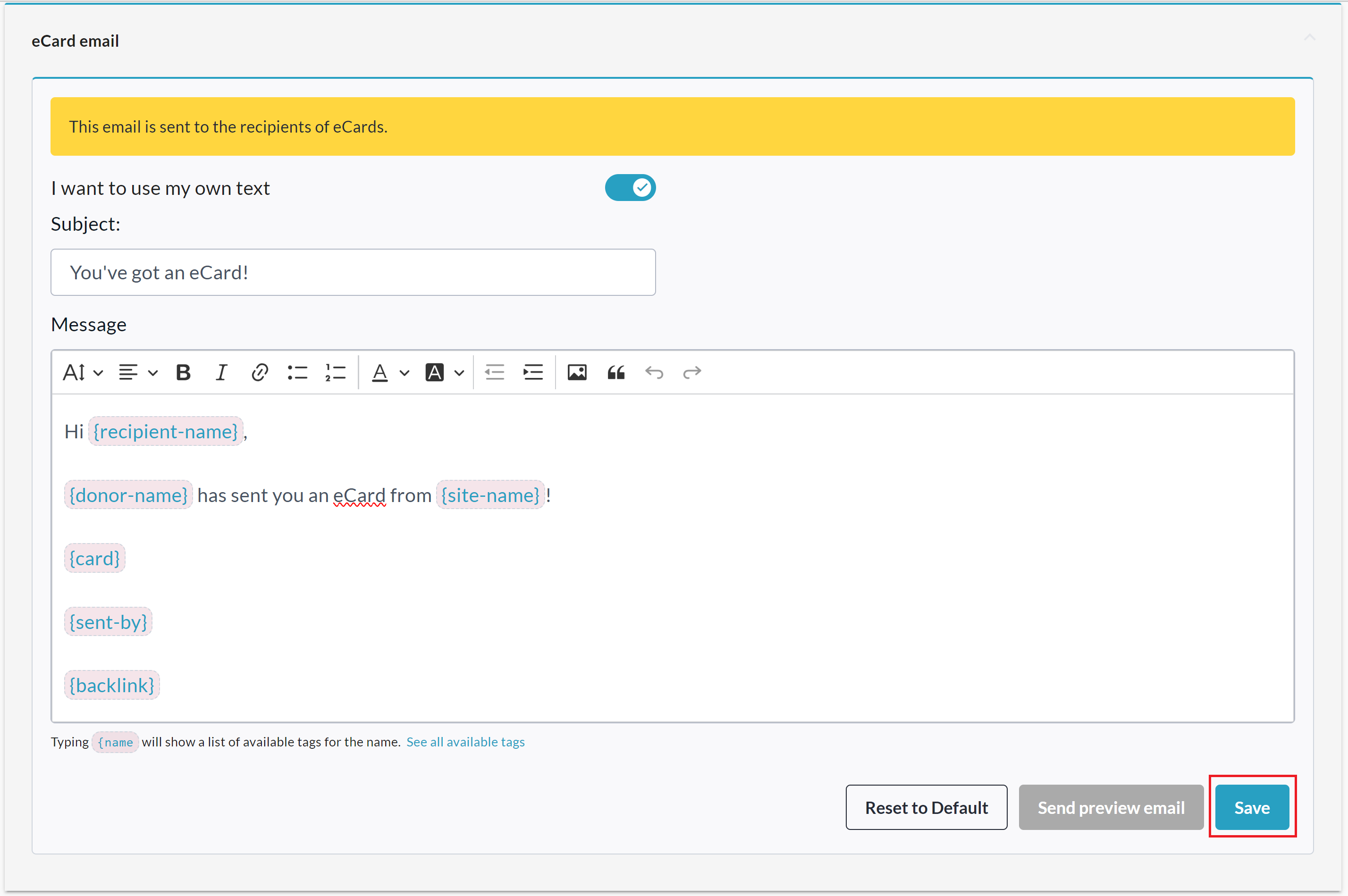 Click on eCard Email and toggle on ‘I want to use my own text’.