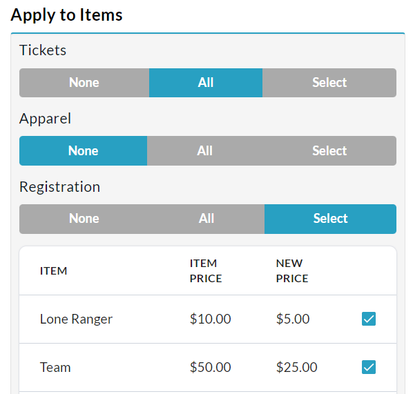 Allows you to set custom prices for all items, or specific Tickets, Registrations, and Apparel options, selectable via the dropdown menu.