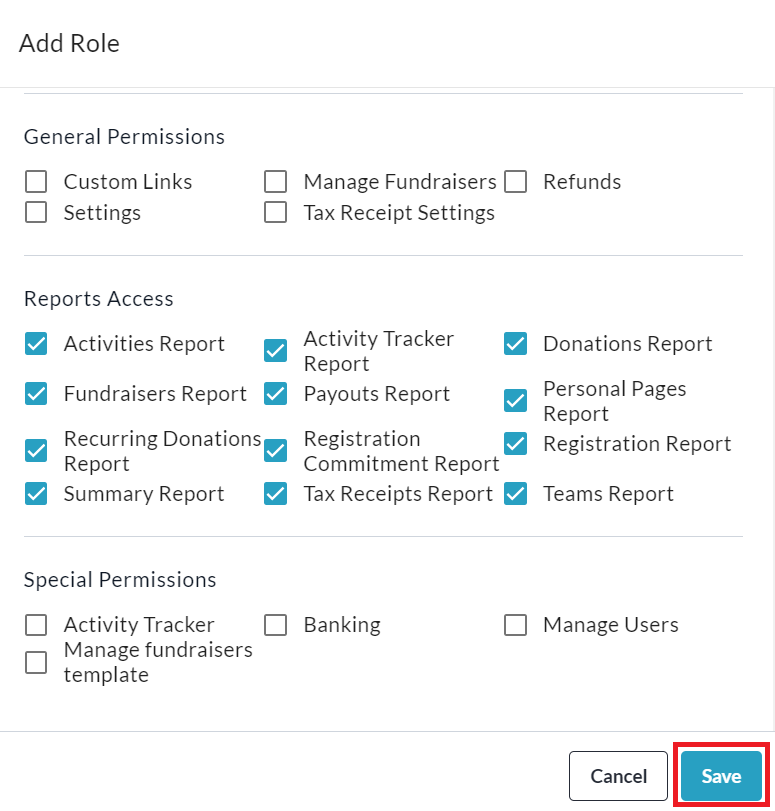 Optional: To create new custom role, click Manage Roles, then Add Role. Check all the permissions you would like to give this user and click Save to confirm. See an example below of ‘Reports-Only’ access.