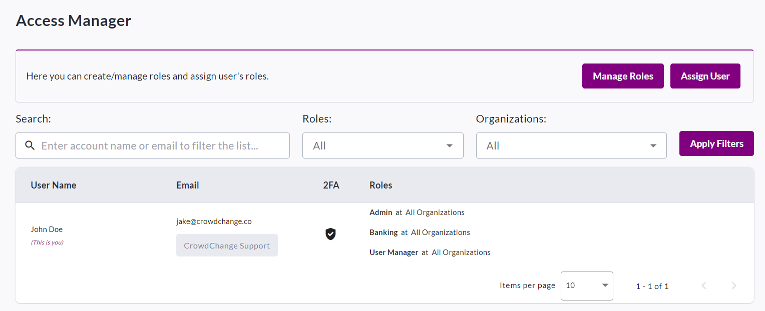 You will be taken to the site-level Access Manager where you will be shown a list of any added users and their assigned roles. The default roles available to be assigned are Admin, Banking and User Manager. You may also add custom roles with specific sets of permissions (for example: Reports-Only access). Roles can be assigned to existing users or new users via email invitation.