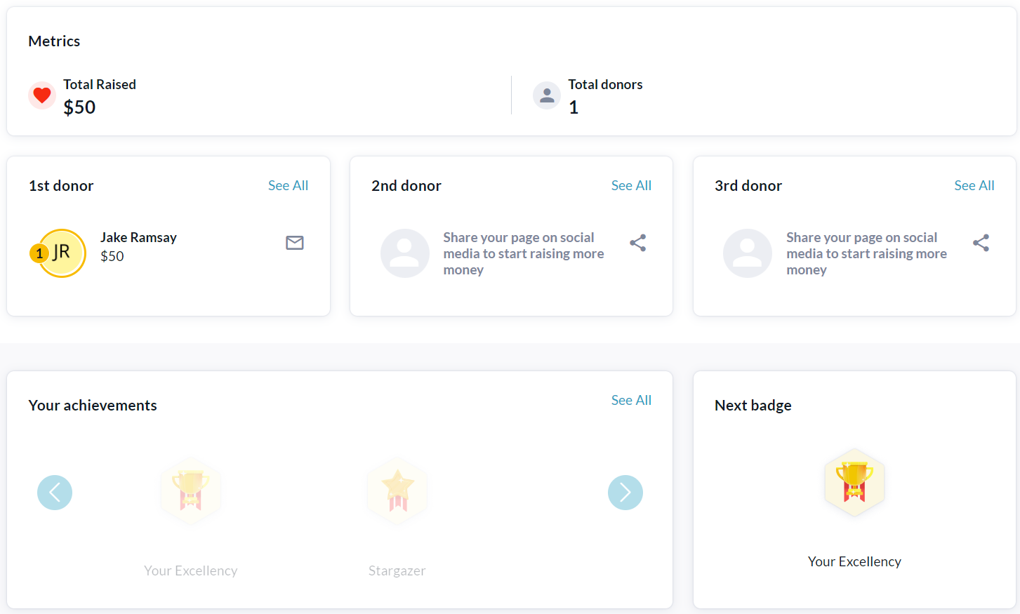 On the Personal Pages tab, clicking a page tile (as shown below) will take you to that page’s Dashboard, where you can get insight on the page strength, fundraising activity and milestone achievements.