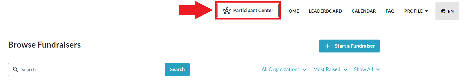 To access the Participant Center (once enabled), from anywhere on your CrowdChange site, click the Participant Center button in the header at the top of the page, as shown below: