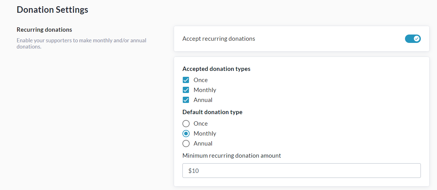 Enable Accept Recurring Donations, then specify your Accepted Donation Types, Default Donation Type, and Minimum Recurring Donation Amount. For example: