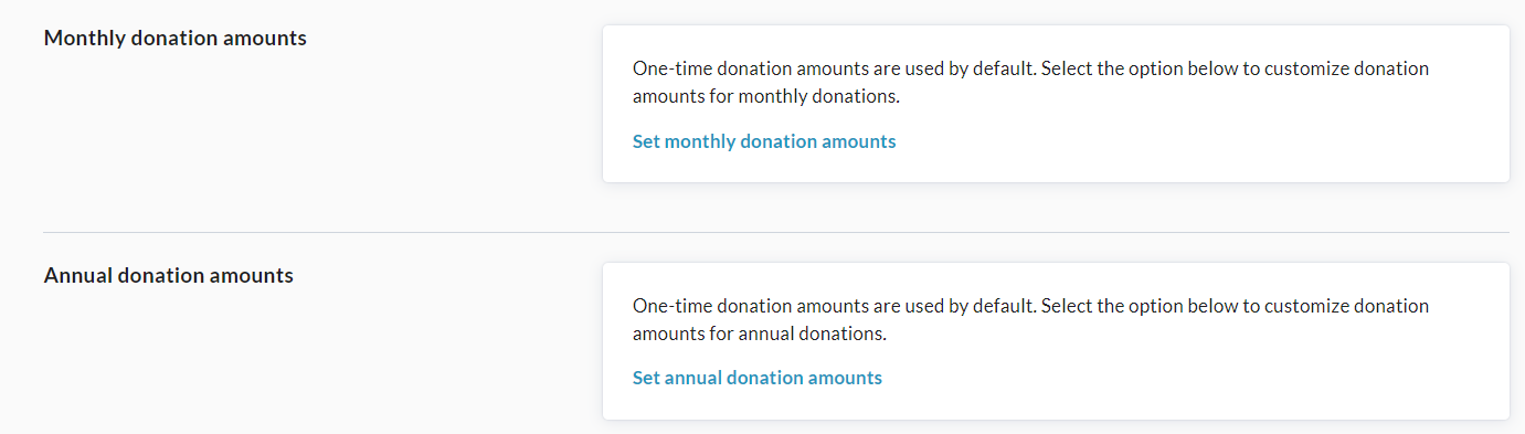 Optional - if desired, you can also set default donation amounts and impact statements for each type of donation you have enabled. To set monthly and annual donation amounts, scroll down to this section: