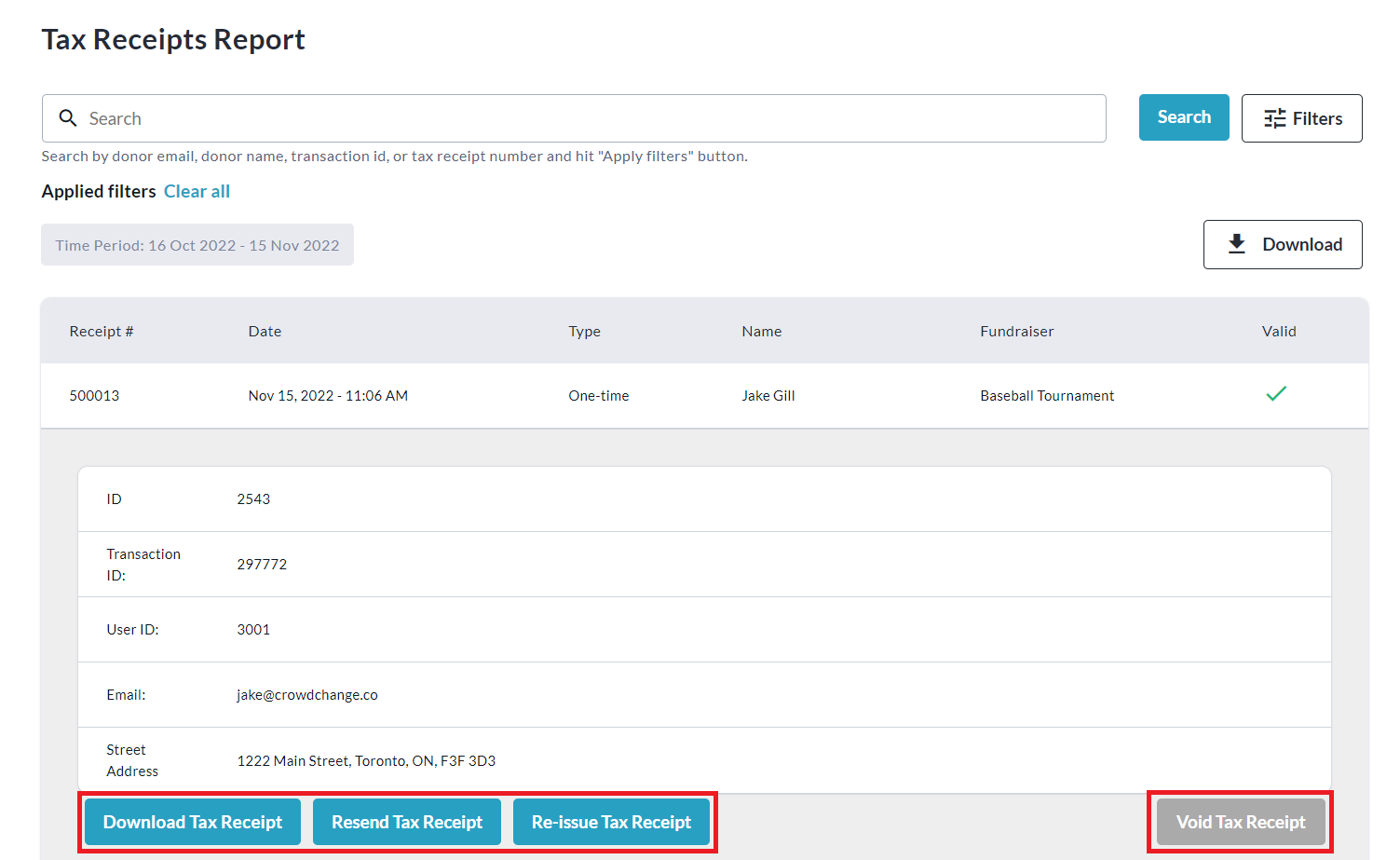 Tax Receipts can be re-issued, re-sent and marked as void via the Tax Receipts report, should you need to change any details on the Tax Receipt.