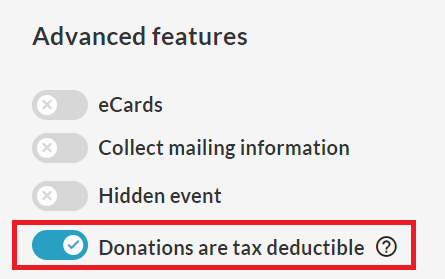Please note that in order to issue Tax Receipts for a fundraiser, the Donations are tax deductible option MUST be turned ON under Advanced Features on the Additional Settings page.